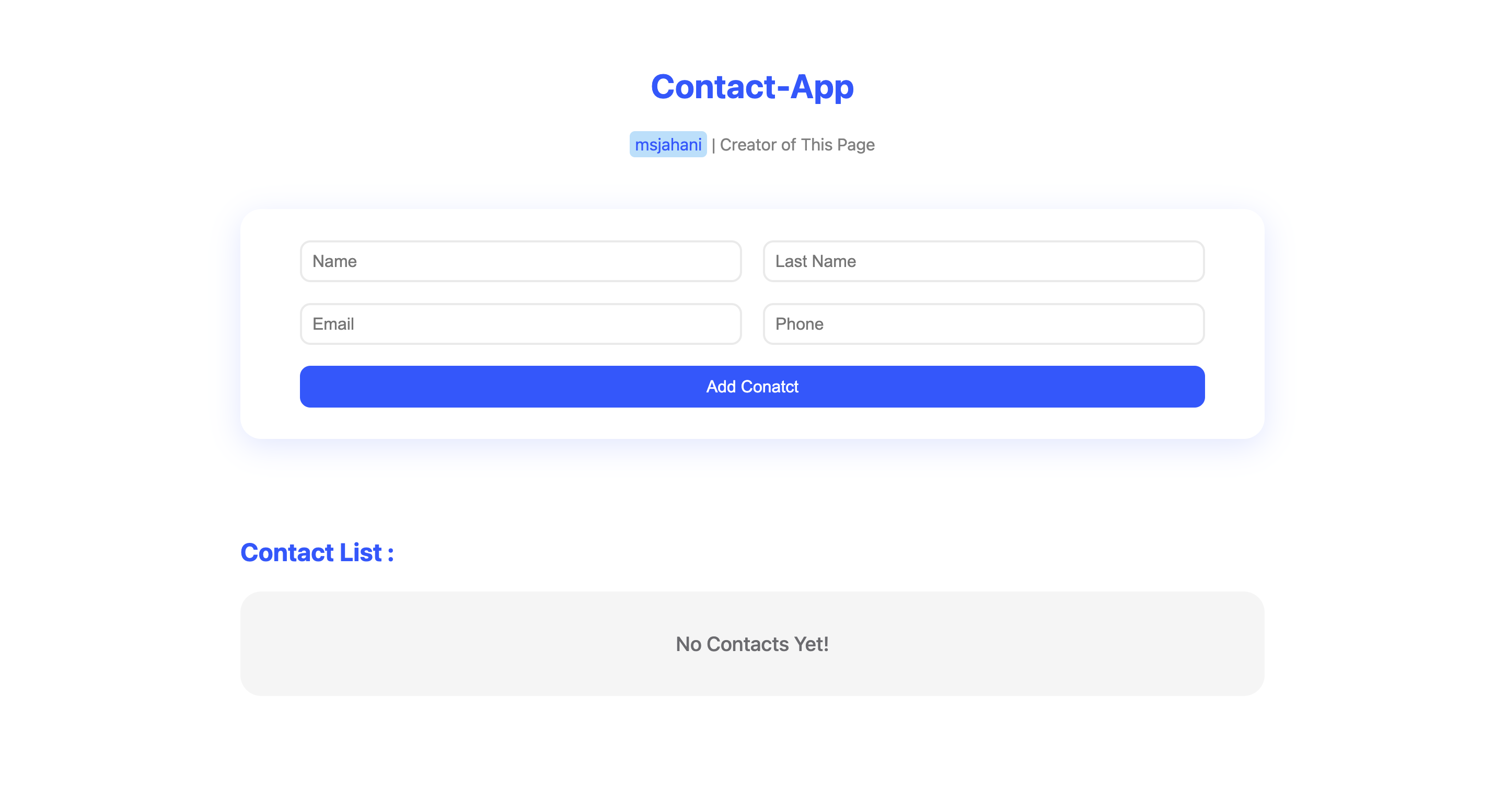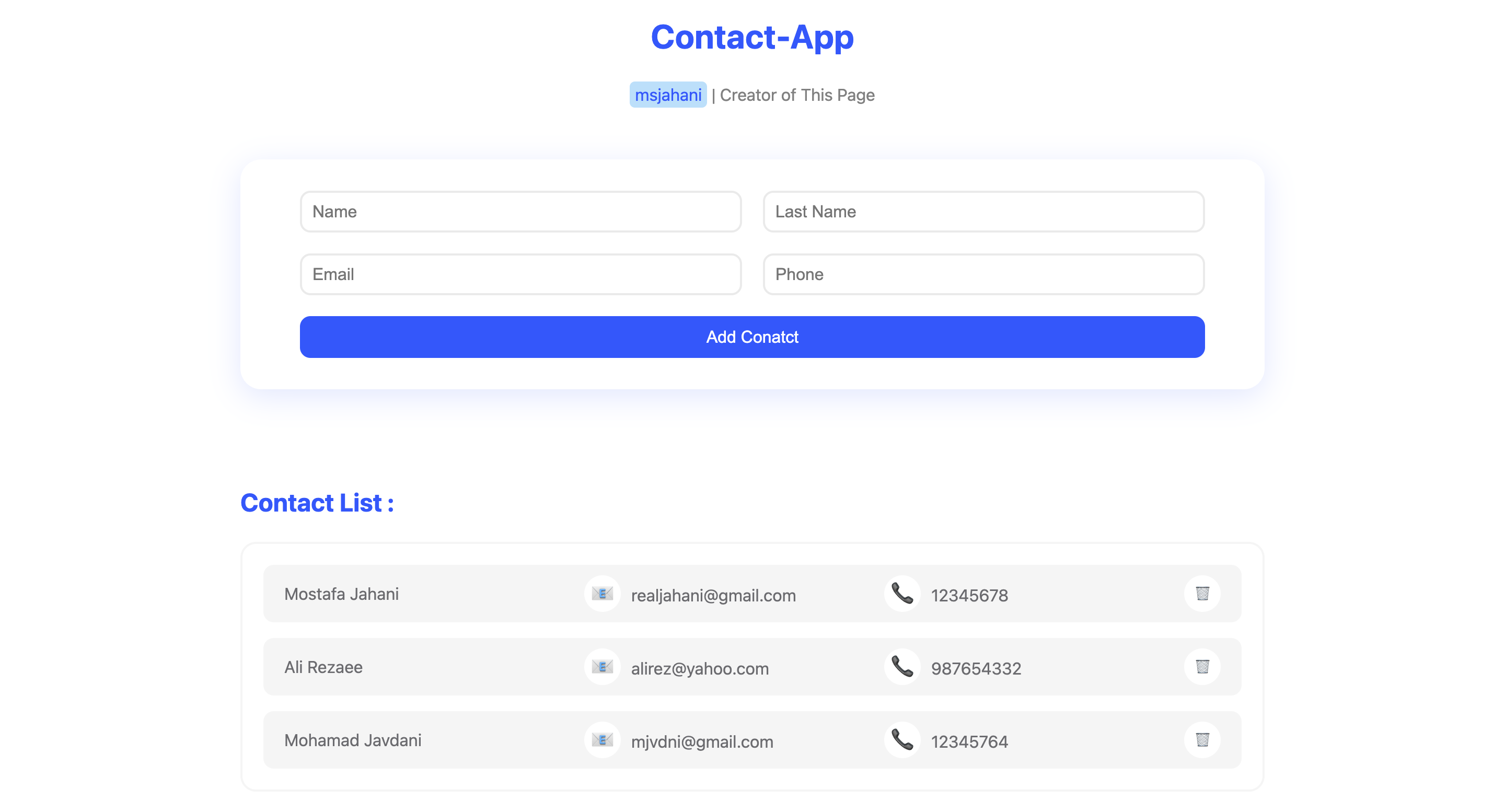 پروژه ثبت مخاطبین | Contact-APP ، که با فریم ورک React نوشته شده و از کاربر ، نام و نام خانوادگی و ایمیل و شماره تلفن را دریافت کرده و پس از اعتبار ‌سنجی مقادیر را در لیستی در پایین فرم نمایش میدهد که امکان حذف مخاطبین به صورت جدا هم وجود دارد .